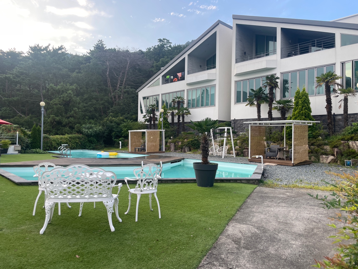 수영장 옆에 인조 잔디가 있는데 이곳에서 매트 깔고 쉴 수도 있었다.