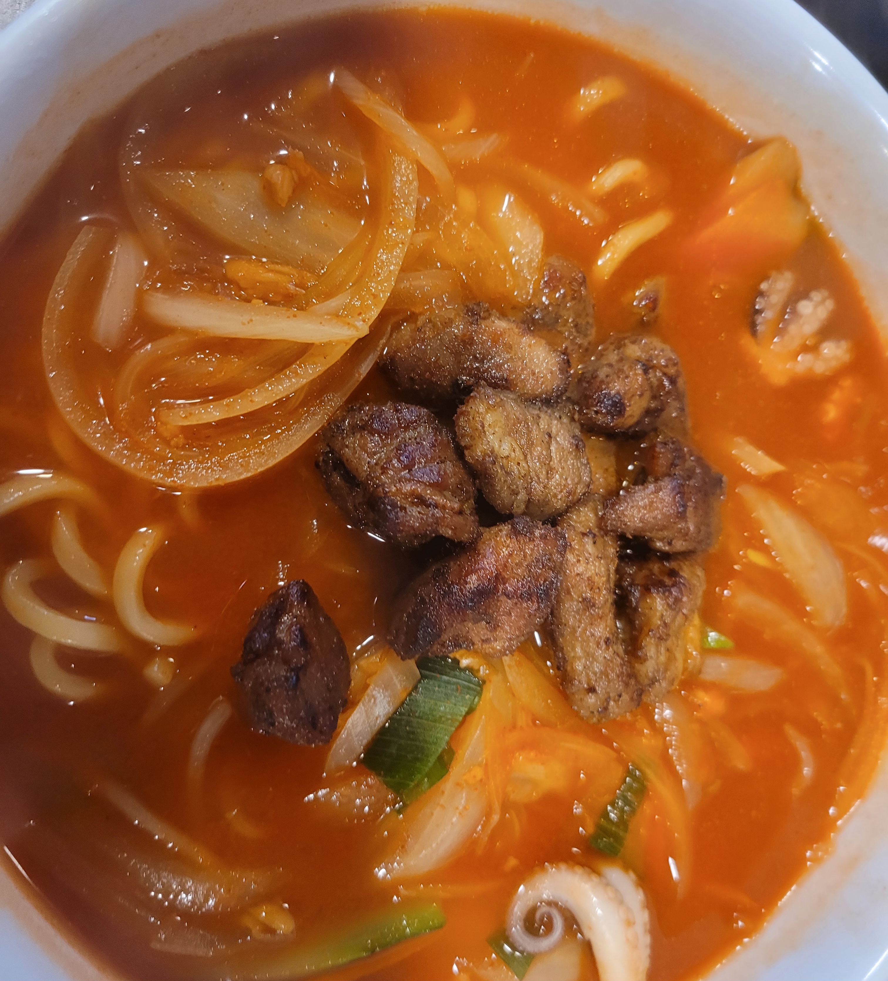 '목살짬뽕'은 직화로 구운 양념 목살이 짬뽕 위에 있다. 이 목살은 9가지 양념에 24시간 숙성했다는데 무조건 맛있을 수밖에 없다. 돼지튀김은 사진을 찍지 못했는데 두툼한 돼지고기를 튀겨 겉바속촉이라 맛있었다.