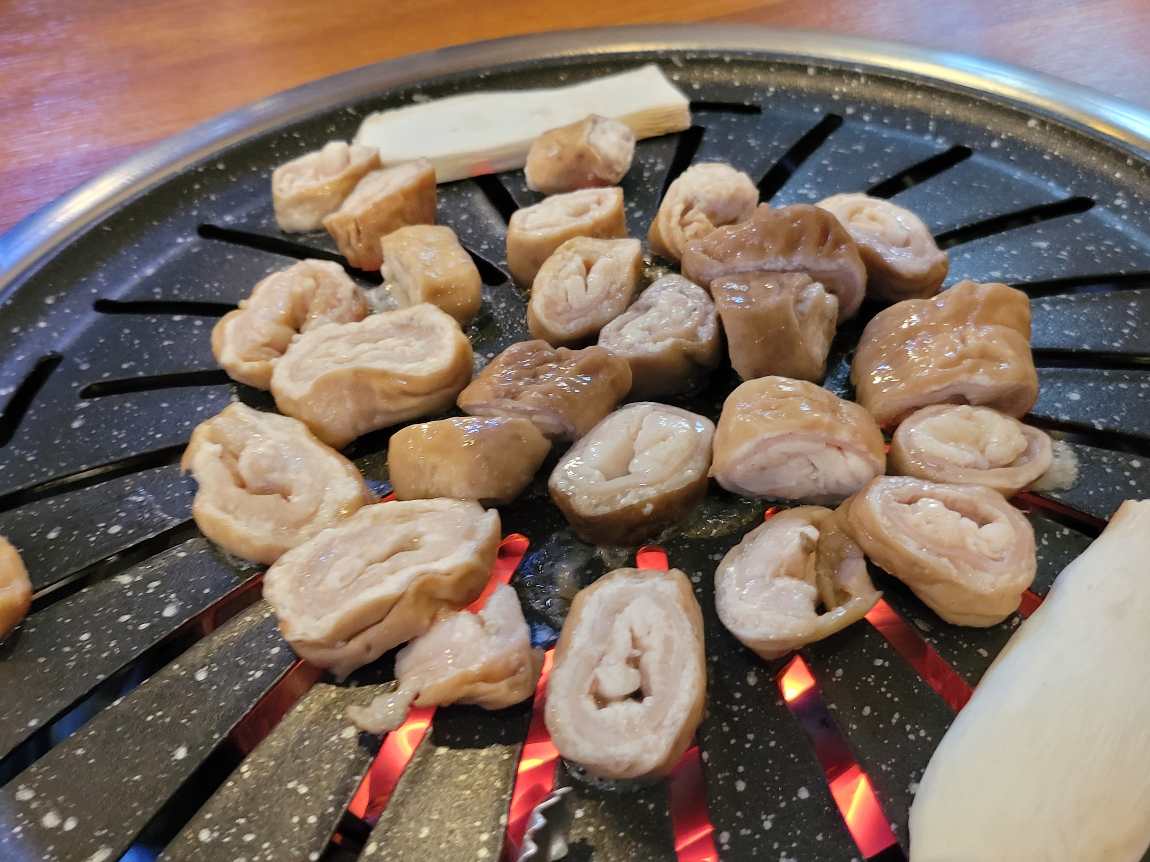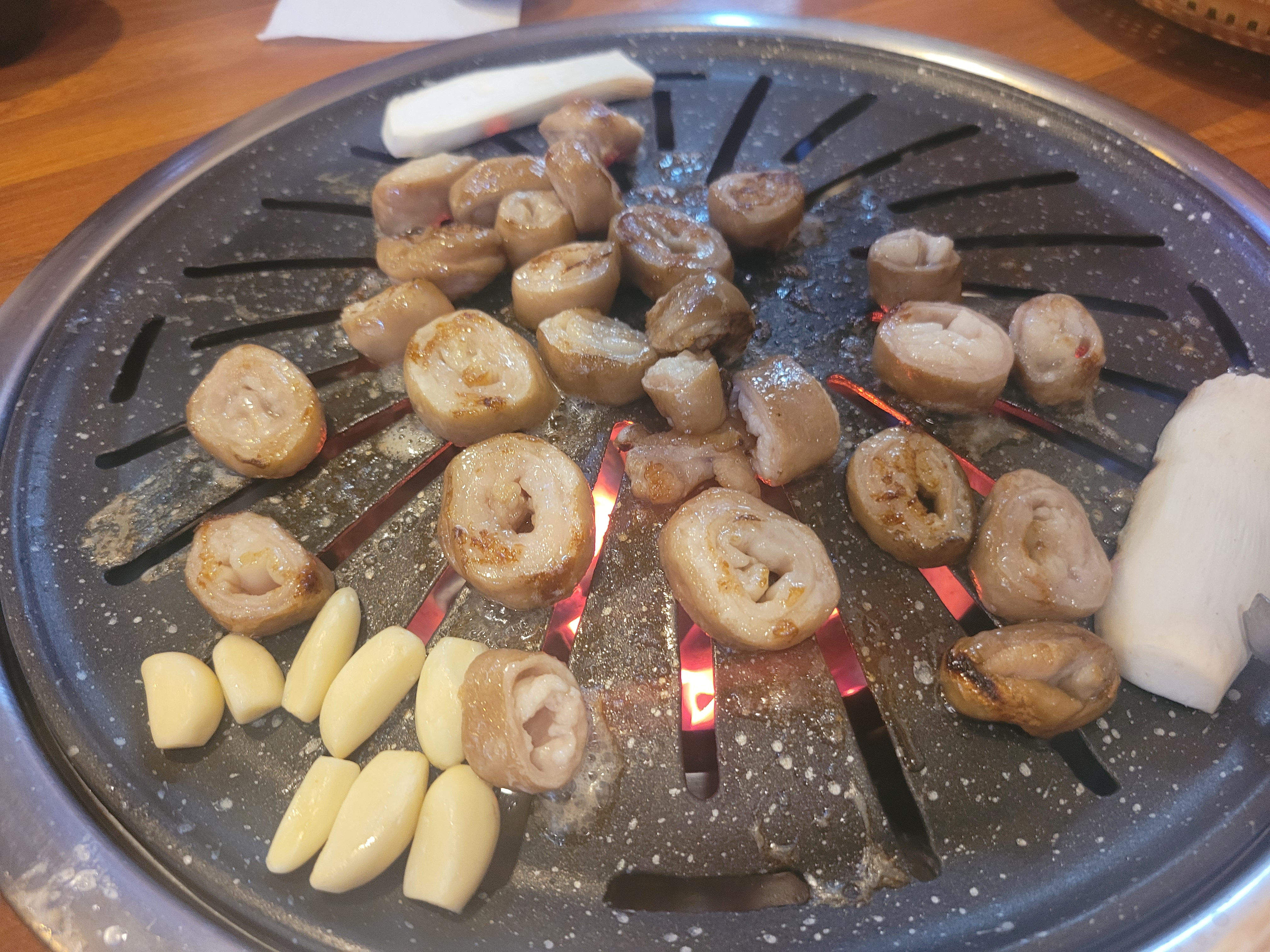 막창을 1차로 삶아 누린내를 제거한 다음, 불판 위에 올렸다.